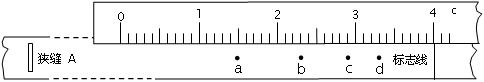 将直径D = 40cm的纸带环,安放在一个可以匀速转动的转台上,纸带上有一狭缝A,A的正对面有一条标志线。油漆喷枪放在开有狭缝B的纸盒里。转台以角速度稳定转动后,开始喷漆,喷出来的雾滴运动速度认为不变。仅当狭缝A和B正对平行时,雾滴才能进入纸带环。改变喷射速度重复实验,已知,在纸带上留下了一系列的痕迹 a、b、c、d。将纸带取下放在刻度尺下,如图所示。