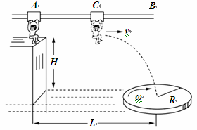 某电视台“快乐向前冲”节目中的场地设施如题图所示,AB为水平直轨道,上面安装有电动悬挂器,可以载人运动,水面上漂浮着一个半径为R,角速度为ω,铺有海绵垫的转盘,转盘的轴心离平台的水平距离为L,平台边缘与转盘平面的高度差为H.选手抓住悬挂器,可以在电动机带动下,从A点下方的平台边缘处沿水平方向做初速度为零,加速度为a的匀加速直线运动.选手必须作好判断,在合适的位置释放,才能顺利落在转盘上.设人的质量为m(不计身高大小),人与转盘间的最大静摩擦力为μmg,重力加速度为g.