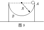 如图9所示,物体A、B的质量分别为m、2m,物体B置于水平面上,B物体上部半圆型槽的半径为R,将物体A从圆槽的右侧最顶端由静止释放,一切摩擦均不计。则