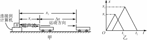 如图甲所示是一种速度传感器的工作原理图,在这个系统中B为一个能发射超声波的固定小盒子,工作时小盒子B向被测物体发出短暂的超声波脉冲,脉冲被运动的物体反射后又被B盒接收,从B盒发射超声波开始计时,经时间Δt0再次发射超声波脉冲,图乙是连续两次发射的超声波的位移—时间图象,则下列说法正确的是( )![]()