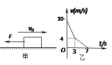 如图甲所示,质量为m = 0.5kg,初速度v0=" 10" m/s的物体,受到一个与初速度v0方向相反的外力F作用,沿粗糙的水平面滑动,物体与地面间的动摩擦因数为μ,经3 s后撤去外力,直到物体停止。整个过程物体的v-t图像如图乙所示 (g=10m/s2)。 则![]()