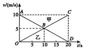 甲乙两辆汽车在平直的公路上沿同一方向作直线运动t =0时刻同时经过公路旁的同一路标。如图是描述两车运动的v-t图线,折线ABC和折线OBD分别描述了甲乙两车在0 ~20 s内的运动情况。关于甲乙两车的运动,下列说法正确是( )![]()