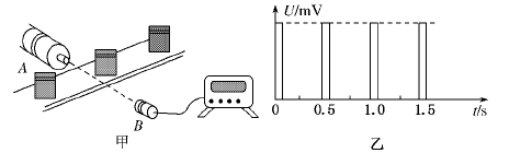 利用光敏电阻制作的光传感器,记录了传送带上工件的输送情况.如图甲所示为某工厂成品包装车间的光传感记录器,光传感器B能接收到发光元件A发出的光.每当工件挡住A发出的光时,光传感器就输出一个电信号,并在屏幕上显示出电信号与时间的关系,如图乙所示.若传送带始终匀速运动,每两个工件间的距离为0.1 m,则下述说法正确的是( )