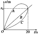 若有A、B、C三辆汽车同时同地出发沿笔直公路行驶,它们运动的情况在x-t图象中如右图所示,则在20 s内,它们的平均速度关系为( )![]()