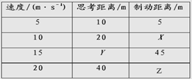 汽车给人类生活带来极大便利,但随着车辆的增多,交通事故也相应增加,重视交通安全问题,关系到千百万人的生命安全与家庭幸福,为了安全,在行驶途中,车与车之间必须保持一定的距离,因为,从驾驶员看见某一情况到采取制动动作的时间里,汽车仍然要通过一段距离(称为思考距离),而从采取制动动作到车完全静止的时间里,汽车又要通过一段距离(称为制动距离),下表给出了驾驶员驾驶的汽车在不同速度下的思考距离和制动距离等部分数据,某同学分析这些数据,算出了表格中未给出的数据X、Y,Z,该同学计算正确的是( )![]()