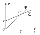 甲乙两车在一平直道路上同向运动,其υ– t图象如图所示,图中△OPQ和△OQT的面积分别为s1和s2(s2 > s1).初始时,甲车在乙车前方s0处。则下列说法中错误的是( )![]()