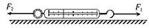 2kg、m2 = 3kg的物体置于光滑的水平面上,中间用轻质弹簧秤连接.两个大小分别为F1=30N、F2 = 20N的水平拉力分别作用在m1、m2上,则( )![]()