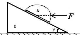 如图所示,一个质量为4kg的半球形物体A 放在倾角为 θ=370的斜面B上静止不动。若用通过球心的水平推力F="10N" 作用在物体上,物体仍静止在斜面上,斜面仍相对地面静止。已知sin370=0.6, cos370=0.8,取g=10m/s2,则![]()