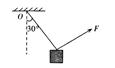 如图所示,一个重为5N的大砝码,用细线悬挂在O点,现在用力F拉砝码,使悬线偏离竖直方向30°时处于静止状态,此时所用拉力F的最小值为( )![]()