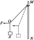 如图所示,轻绳一端系在质量为m的物块A上,另一端系在一个套在粗糙竖直杆MN的圆环上.现用水平力F拉住绳子上一点O,使物块A从图中实线位置缓慢下降到虚线位置,但圆环仍保持在原来位置不动.在这一过程中,环对杆的摩擦力F1和环对杆的压力F2的变化情况是 ![]()