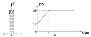 如图a所示,一轻质弹簧的下端固定在水平面上,上端放置一物体(物体与弹簧不连接),初始时物体处于静止状态。现用竖直向上的拉力F作用在物体上,使物体开始向上做匀加速运动,拉力F与物体位移x的关系如图b所示(g=10m/s2),则正确的结论是( )![]()
