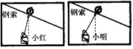 在一种速降娱乐项目中,人乘坐在吊篮中,吊篮通过滑轮沿一条倾斜的钢索向下滑行。现有两条彼此平行的钢索,它们的起、终点分别位于同一高度。小红和小明分别乘吊篮从速降的起点由静止开始下滑,在他们下滑过程中,当吊篮与滑轮达到相对静止状态时,分别拍下一张照片,如图所示。已知二人运动过程中,空气阻力的影响可以忽略,则![]()