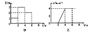 放在水平地面上的一物块,受到方向不变的水平推力F的作用,F的大小与时间t的关系如图甲所示,物块速度v与时间t的关系如图乙所示。取重力加速度g="10" m/s2。由此两图线可以得出物块 ( )![]()