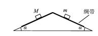 (2011·江苏物理·T9)如图所示,倾角为α的等腰三角形斜面固定在水平面上,一足够长的轻质绸带跨过斜面的顶端铺放在斜面的两侧,绸带与斜面间无摩擦。现将质量分别为M、m(M>m)的小物块同时轻放在斜面两侧的绸带上。两物块与绸带间的动摩擦因数相等,且最大静摩擦力与滑动摩擦力大小相等。在α角取不同值的情况下,下列说法正确的有( )![]()