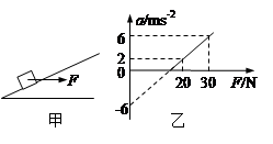 如图甲所示,用一水平力F拉着一个静止在倾角为q的光滑斜面上的物体,逐渐增大F,物体做变加速运动,其加速度a随外力F变化的图像如图乙所示,根据图乙中所提供的信息可以计算出(取g="10" m/s2)![]()