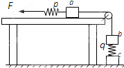 三个质量均为1 kg的相同木块a、b、c和两个劲度均为500 N/m的相同轻弹簧p、q用轻绳连接如图,其中a放在光滑水平桌面上。开始时p弹簧处于原长,木块都处于静止。现用水平力缓慢地向左拉p弹簧的左端,直到c木块刚好离开水平地面为止,