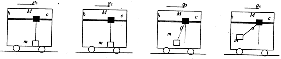 一辆小车静止在水平地面上,bc是固定在小车上的水平横杆,物块M穿在杆上,M通过线悬吊着小物体m,m在小车的水平底板上,小车未动时,细线恰好在竖直方向上,现使车向右运动,全过程中M始终未相对杆bc移动,M、m与小车保持相对静止,已知a1:a2:a3:a4=1:2:4:8,M受到的摩擦力大小依次为f1、f2、f3、f4,则以上结论正确的是 ( )![]()