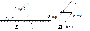 如图(a)所示,质量M = 10.0kg的滑块放在水平地面上,滑块上固定一个轻细杆ABC,∠ABC = 30°.在A端固定一个质量为m = 2.0kg的小球,滑块与地面间的动摩擦因数m = 0.50.现对滑块施加一个水平向右的推力F1 = 180N,使滑块做匀加速运动.求此时轻杆对小球作用力F2的大小和方向.(取g=10m/s2)