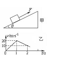 如图甲所示,质量为m=1kg的物体置于倾角为θ=37°的固定且足够长的斜面上,对物体施以平行于斜面向上的拉力F,t1=1s时撤去拉力,物体运动的部分v—t图像如图乙所示。试求:(1)拉力F的大小。(2)t=4s时物体的速度v的大小。