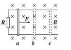 如图所示,水平面内两光滑的平行金属导轨,左端与电阻R相连接,匀强磁场B竖直向下分布在导轨所在的空间内,质量一定的金属棒垂直于导轨并与导轨接触良好.今对金属棒施加一个水平向右的外力F,使金属棒从a位置开始向右做初速度为零的匀加速运动,依次通过位置b和c。.若导轨与金属棒的电阻不计,ab与bc的距离相等,关于金属棒在运动过程中的有关说法正确的是( )![]()