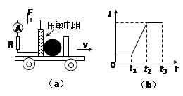 压敏电阻的阻值随所受压力的增大而减小,有位同学利用压敏电阻设计了判断小车运动状态的装置,其工作原理如图(a)所示,将压敏电阻和一块挡板固定在绝缘小车上,中间放置一个绝缘重球。小车向右做直线运动过程中,电流表示数如图5(b)所示,下列判断正确的是![]()