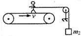 如图所示为一种测定运动员体能的装置,运动员的质量为m1,绳的一端拴在腰间并沿水平方向跨过滑轮(不计滑轮质量及摩擦),绳的下端悬挂一个质量为m2的重物,人用力蹬传送带而人的重心不动,使传送带以速率v匀速向右运动。下面说法中正确的是( )![]()