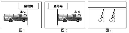 s末两个时刻经过同一路牌的两张照片.当t=0时,汽车刚启动,在这段时间内汽车的运动可看成匀加速直线运动.图c是车内水平横杆上用轻绳悬挂的拉手环经放大后的图像,轻绳与竖直方向的夹角为θ=370.根据题中提供的信息,不能计算出的物理量有( )(已知sin370=0.6,cos370=0.8,g取10m/s2)![]()