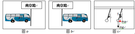 如图中a、b所示,是一辆质量m=6×103kg的公共汽车在t=0和t=4s末两个时刻的两张照片。当t=0时,汽车刚启动(汽车的运动可看成匀加速直线运动).图c是车内横杆上悬挂的拉手环经放大后的图像,测得θ=300.根据题中提供的信息,不可以估算出的物理量有 ( )![]()