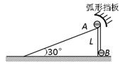 如图所示,倾角为30°、高为L的固定斜面底端与水平面平滑相连,质量分别为3m、m的两个小球A、B用一根长为L的轻绳连接,A球置于斜面顶端,现由静止释放A、B两球,球B与弧形挡板碰撞过程中无机械能损失,且碰后只能沿斜面下滑,它们最终均滑至水平面上。重力加速度为g,不计一切摩擦。则![]()