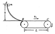 如图所示,一质量为m的滑块从高为h的光滑圆弧形槽的顶端A处无初速度地滑下,槽的底端B与水平传送带相接,传送带的运行速度为v0,长为L,滑块滑到传送带上后做匀加速运动,滑到传送带右端C时,恰好被加速到与传送带的速度相同.求:(1)滑块到达底端B时的速度v;(2)滑块与传送带间的动摩擦因数;(3)此过程中,由于克服摩擦力做功而产生的热量Q.
