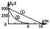 自动充电式电动车将电动车的前轮装有发电机,发电机与蓄电池连接。当骑车者用力蹬车或电动自行车自动滑行时,自行车就可以通过发电机向蓄电池充电,将其他形式的能转化成电能储存起来。现有某人骑车以500J的初动能在粗糙的水平路面上滑行,第一次关闭自充电装置,让车自由滑行,其动能随位移变化关系如图中的线①所示;第二次启动自充电装置,其动能随位移变化关系如图线②所示,则第二次向蓄电池所充的电能是:![]()