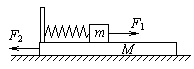 如图所示,一轻弹簧左端固定在长木板M的左端,右端与小木块m连接,且m、M及M与地面间摩擦不计.开始时,m和M均静止,现同时对m、M施加等大反向的水平恒力F1和F2,设两物体开始运动以后的整个运动过程中,弹簧形变不超过其弹性限度。对于m、M和弹簧组成的系统![]()