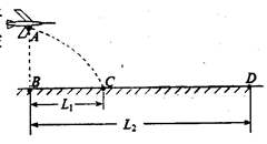 如图所示,水平地面的上空有一架飞机在进行投弹训练,飞机沿水平方向作匀加速直线运动.当飞机飞经观察点B点正上方A点时投放一颗炸弹,经时间T炸弹落在观察点B正前方L1处的C点,与此同时飞机投放出第二颗炸弹,最终落在距观察点B正前方L2处的D点,且