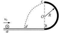 水平光滑直轨道ab与半径为R的竖直半圆形光滑轨道bc相切,一小球以初速度v0沿直线轨道向右运动,如图所示,小球进入圆形轨道后刚好能通过c点,然后小球做平抛运动落在直轨道上的d点,则( )![]()