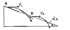 如图所示,从倾角为θ的足够长的斜面A点先将小球以速度V1水平向右抛出,球落到斜面上前一瞬间的速度方向与斜面夹角为α1。然后在B点以速度V2(V1>V2)水平向右抛出,球落到斜面上前一瞬间的速度方向与斜面夹角为α2,则:![]()