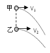 如图所示,甲、乙两球位于同一竖直线上的不同位置,甲比乙高。将甲、乙两球分别以V1、V2的速度沿同一水平方向抛出,不计空气阻力,下列说法中正确的是( )![]()