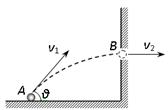 如图所示,在水平地面上的A点以速度v1射出一弹丸,方向与地面成θ角,经过一段时间,弹丸恰好以v2的速度垂直穿入竖直壁上的小孔B
