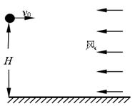 (8分)如图所示,从H=45m高处水平抛出的小球,除受重力外,还受到水平风力作用,假设风力大小恒为小球重力的0.2倍,g=10m/s2.问:(1)有水平风力与无风时相比较,小球在空中的飞行时间是否相同?如不相同,说明理由;如果相同,求出这段时间?(2)为使小球能垂直于地面着地, 水平抛出的初速度v0=?