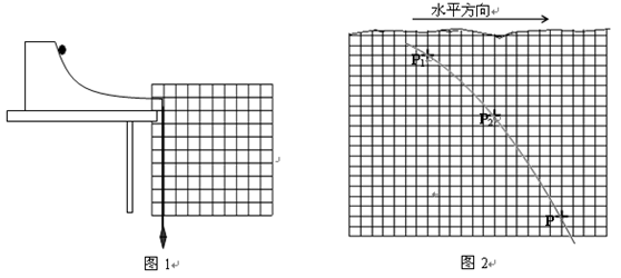 某同学利用图1所示装置做“研究平抛运动”的实验,根据实验结果在坐标纸上描出了小球水平抛出后的运动轨迹,但不慎将画有轨迹图线的坐标纸丢失了一部分,剩余部分如图2所示,图2中水平方向与竖直方向每小格的长度均代表0.10m,P1、P2和P3是轨迹图线上的3个点, P1和P2、P2和P3之间的水平距离相等。(g=10m/s2,不计空气阻力)![]()