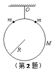 如图2所示,有一质量为M的大圆环,半径为R,被一轻杆固定后悬挂在O点,有两个质量为m的小环(可视为质点),同时从大环两侧的对称位置由静止滑下。两小环同时滑到大环底部时,速度都为v,则此时大环对轻杆的拉力大小为( )![]()