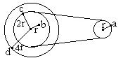 图中所示为一皮带传动装置,右轮的半径为r,a是它边缘上的一点。左侧是一轮轴,大轮的半径为4r,小轮的半径为2r。b点在小轮上,到小轮中心的距离为r。c点和d点分别位于小轮和大轮的边缘上。若在传动过程中,皮带不打滑。则( )![]()