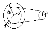 右图中所示为一皮带传动装置,右轮的半径为r,a是它边缘上的一点。左侧是一轮轴,大轮的半径为4r,小轮的半径为2r。b点在小轮上,到小轮中心的距离为r。c点和d点分别位于小轮和大轮的边缘上。若在传动过程中,皮带不打滑![]()