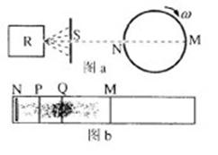 如图所示,a为测量分子速率分布的装置示意图。圆筒绕其中心匀速转动,侧面开有狭缝N,内侧贴有记录薄膜,M为正对狭缝的位置。从原子炉R中射出的银原子蒸汽穿过屏上的S缝后进入狭缝N,在圆筒转动半个周期的时间内相继到达并沉积在薄膜上。展开的薄膜如图b所示,NP、PQ间距相等。则( )![]()