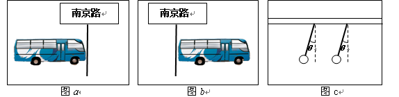 如图a、b所示,是一辆质量m=6×103kg的公共汽车在t=0和t=4s末两个时刻的两张照片。当t=0时,汽车刚启动(汽车的运动可看成匀加速直线运动).图c是车内横杆上悬挂的拉手环经放大后的图像,测得θ=150.根据题中提供的信息,可以估算出的物理量有 ( ) ![]()