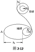 “嫦娥奔月”的过程可以简化为如图2-12所示:“嫦娥一号”升空后,绕地球沿椭圆轨道运动,远地点A距地面高为h1,然后经过变轨被月球捕获,再经多次变轨,最终在距离月球表面高为h2的轨道上绕月球做匀速圆周运动.若已知地球的半径为R1、表面重力加速度为g0,月球的质量为M、半径为R2,引力常量为G,根据以上信息,可以确定 ( ) ![]()