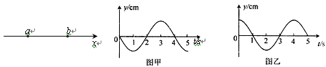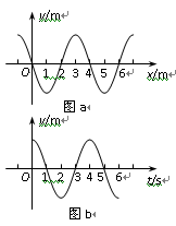 如下图所示,一列简谐横波在x轴上传播,图甲和图乙分别为x轴上a、b两质点的振动图象,且
