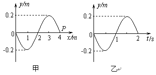 如图甲所示为一简谐波在t=0时刻的图象,图乙所示为x=4m处的质点P的振动图象,则下列判断正确的是 ( )![]()