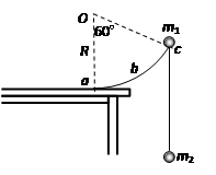 如图所示,圆心在O点、半径为R的圆弧轨道abc竖直固定在水平桌面上,Oc与Oa的夹角为60°,轨道最低点a与桌面相切. 一轻绳两端系着质量为m1和m2的小球(均可视为质点),挂在圆弧轨道边缘c的两边,开始时,m1位于c点,然后从静止释放,设轻绳足够长,不计一切摩擦。则![]()