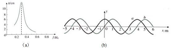 如图,(a)为一波源的共振曲线,(b)图中的a表示该波源在共振状态下的振动形式沿x轴传播过程中形成的机械波在t=0时刻的波形曲线。则下列说法正确的是( )![]()