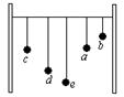如图所示,在一根张紧的水平绳上,悬挂有 a、b、c、d、e五个单摆,让a摆略偏离平衡位置后无初速释放,在垂直纸面的平面内振动;接着其余各摆也开始振动。下列说法中正确的有:( )![]()